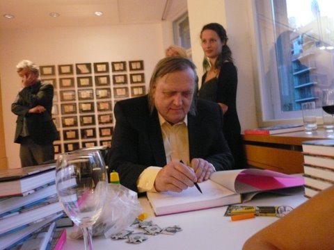 • 12-10-2010  Artist Jan Henderikse signing his book Jan Henderikse Acheiropoieta with  essays by Antoon Melissen and Renate Wiehager. In Berlin. Right is Rosa de Jong, Amsterdam. (photo Sherman de Jesus, Memphis Film + Television)